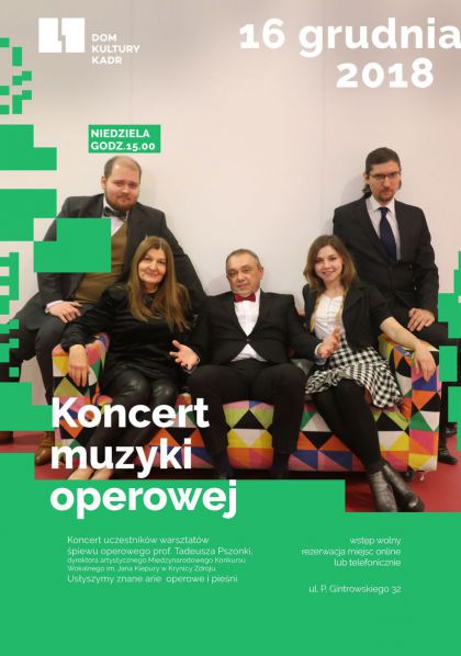 Koncert uczestników warsztatów śpiewu operowego prof. Tadeusza Pszonki, dyrektora artystycznego Międzynarodowego Konkursu Wokalnego im. Jana Kiepury w Krynicy Zdroju. Usłyszymy znane arie operowe i pieśni.