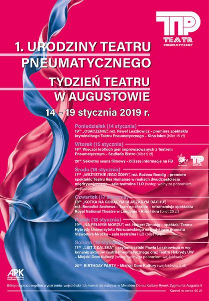 Działający przy Augustowskich Placówkach Kultury Teatr Pneumatyczny będzie obchodził w styczniu swoje pierwsze urodziny. Aktorzy tworzący razem z Pawłem Leszkowiczem teatr amatorski zapraszają na Tydzień Teatru w Augustowie, czyli Pierwsze Urodziny Teatru Pneumatycznego w dniach 14-19.01.2019 r. Ten, kto widział pierwszą „pneumatyczną” sztukę „Jezioro” wg „Mewy” Czechowa, wie że Teatr Pneumatyczny, chociaż tworzony przez nieprofesjonalnych aktorów, to serwuje sztukę przez wielkie „S”.