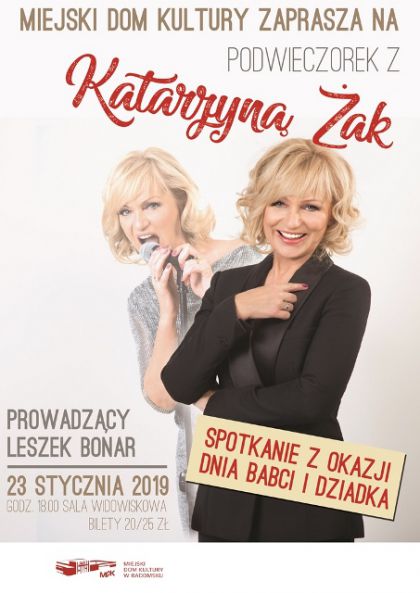Kontynuujemy cykl spotkań z gwiazdami pn „Podwieczorek z …”. 23 stycznia 2018 o godz. 18.00 gościem dziennikarza Leszka Bonara będzie Katarzyna Żak – polska aktorka filmowa, telewizyjna i teatralna oraz piosenkarka. Podczas spotkania z radomszczańską publicznością artystka przybliży życie prywatne i zawodowe oraz zaśpiewa swoje najpopularniejsze utwory. Popularność zyskała dzięki rolom w serialach „Miodowe lata”, „Całkiem nowe lata miodowe” i „Ranczo”. W 1986 ukończyła studia na Wydziale Lalkarskim Państwowej Wyższej Szkoły Teatralnej w Krakowie Filia we Wrocławiu. W latach 1986–1995 występowała w Teatrze Współczesnym im. Edmunda Wiercińskiego we Wrocławiu. W 1993 otrzymała Nagrodę Towarzystwa Przyjaciół Teatru we Wrocławiu dla młodego aktora. W latach 1995-2011 aktorka warszawskiego Teatru Rampa w Warszawie. Aktualnie występuje w warszawskich teatrach: Roma, Och-Teatr, Capitol, Syrena i Komedia.