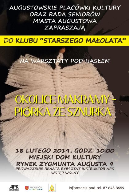 Augustowskie Placówki Kultury oraz Rada Seniorów Miasta Augustowa serdecznie zapraszają do Miejskiego Domu Kultury (Rynek Zygmunta Augusta 9) na cykl spotkań w ramach Klubu „Starszego Małolata”. Inauguracyjne warsztaty z plecenia makramy (bezpłatne), które poprowadzi Renata Rybsztat (instruktor MDK) odbędą się już w poniedziałek 18 lutego o godz. 10:00.