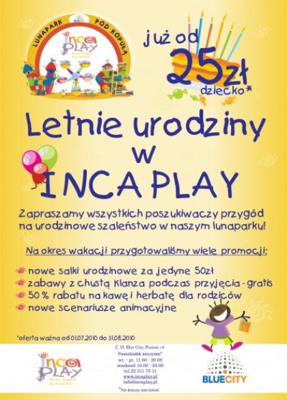 Plac zabaw Inca Play na okres wakacyjny przygotował moc promocji dla swoich najmłodszych klientów. Wejścia indywidualne -25%. Obniżki urodzinowe: salki i termosy z kawą i herbatą -50%, animacja z chustą Klanza gratis, do tego nowe scenariusze urodzinowe. Serdecznie zapraszamy na letnie urodziny w Inca Play.