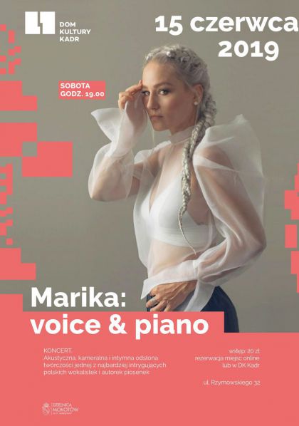 Marika wystąpi w towarzystwie pianisty Patryka Kraśniewskiego. W duecie wykonają utwory z ostatniej płyty oraz największe przeboje Mariki w zupełnie nowych, akustycznych aranżacjach. Będzie intymna atmosfera do pośmiania się, ale też do popłakania. Po koncercie odbędzie się spotkanie z artystką, Marika będzie miała ze sobą płyty oraz książkę. Idealna propozycja na sobotni wieczór.
