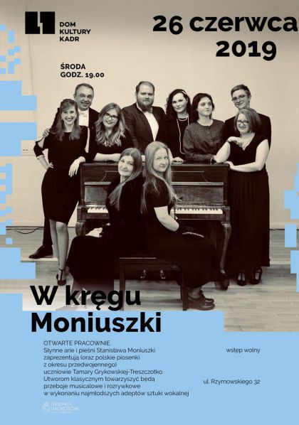 Słynne arie i pieśni Stanisława Moniuszki (oraz polskie piosenki z okresu przedwojennego) zaprezentują uczniowie Tamary Grykowskiej-Treszczotko ze Szkoły Śpiewu Operowego. Utworom klasycznym towarzyszyć będą przeboje musicalowe i rozrywkowe w wykonaniu najmłodszych adeptów sztuki wokalnej.