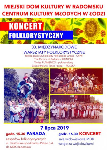 7 lipca 2019 wspólnie z Centrum Kultury Młodych w Łodzi zapraszamy na barwny koncert folklorystyczny. Na scenie MDK o godz. 16.30 prezentacje taneczne i muzyczne przedstawią zespoły: Yenibogazici Municipality Folk Dance Group – CYPR, The Rythms of Balkans – RUMUNIA, Taniec FLAMENCO – pokaz solowy, Zespół Pieśni i Tańca „Łódź” – POLSKA. Koncert poprzedzi o godz. 15.30 barwna parada zespołów, która rozpocznie się pod Bankiem Pekao S.A. następnie przejdzie ul. Piastowską w kierunku MDK w Radomsku. Koncert i parada organizowane w ramach Warsztatów są wyjątkową okazją do zapoznania się z tradycją, folklorem i kulturą naszych bliższych i dalszych sąsiadów.