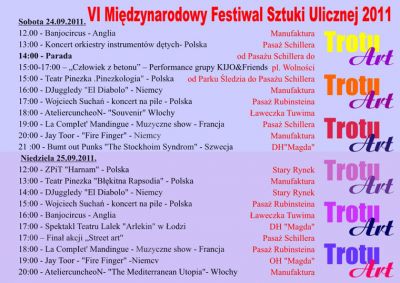 Międzynarodowy Festiwal Sztuki Ulicznej TrotuArt odbywać się będzie w kilku punktach Łodzi: na Starym Rynku, pasażu Schillera, pasażu Rubinsteina i na ulicy Piotrkowskiej. Szczudlarze, klauni, postacie w kostiumach i teatralnych maskach, mimowie, bawią publiczność przy dźwięku orkiestr. Organizatorami festiwalu są Teatr Lalek Arlekin i łódzki magistrat.