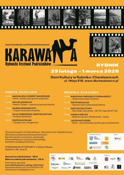 UWAGA! Każdego festiwalowego dnia, jeden z uczestników Karawany otrzyma bezpłatne zaproszenie na atrakcyjną wycieczkę organizowaną przez Rybnicki Oddział PTTK. Po każdym festiwalowym dniu - Podróżnicze After Party w „Żółtym Młynku” - Rybnik ul. Św. Jana 2.