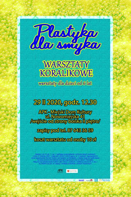 Augustowskie Placówki Kultury zapraszają dzieci w wieku od 6 lat na zajęcia z cyklu Plastyka dla Smyka. W sobotę 29 lutego w Miejskim Domu Kultury (ul. Nowomiejska 41, wejście od strony boiska, II piętro) o godz. 12:30 będziemy uczyć się robić biżuterię z koralików. Bransoletki, korale, broszki, a może coś we włosy? Co powstanie podczas warsztatów zależy tylko od Was. Koszt zajęć 10 zł. Ilość miejsc ograniczona. Zapisy przyjmujemy pod numerem telefonu 87 643 36 59 lub osobiście w Miejskim Domu Kultury.