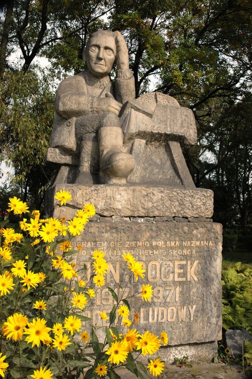 JAN POCEK – poeta ludowy urodzony w 1917 r. w Zabłociu k. Markuszowa, pow. Puławy, zmarł w 1971 r. w Kaleniu. Debiutował w „Wiciach” (1935). W czasie okupacji drukował w prasie konspiracyjnej, działał w Związku Pisarzy Polskich i grupie pisarzy ludowych „Wieś Tworząca”. Po wojnie prowadził gospodarstwo rolne we wsi Kaleń, pracował też jako dziennikarz „Gromady – Rolnika Polskiego”. Członek Stowarzyszenia Dziennikarzy Polskich i Klubu Pisarzy Ludowych, członek – założyciel Stowarzyszenia Twórców Ludowych w 1968 r., odznaczony Złotym Krzyżem Zasługi (1969). Jest przede wszystkim autorem wierszy, drukował w prasie codziennej, pismach literackich i w wielu antologiach. Autorskie edycje jego twórczości: Zgrzebne pieśni (1947), Malwy (1963), Wiersze (1973), Poezje (1980), Głosy Ziemi (1981), Poezje wybrane (1988). W roku 1962 nakręcono film o J. Pocku „W polu”. W 1989 r. Józef Zięba opublikował książkę „Jan Pocek 1917 – 1971”. W 1972 r. po raz pierwszy przyznano Nagrodę Artystyczną im. J. Pocka ustanowioną przez „Chłopską Drogę”. W tym też roku STL zaczął organizować dla swoich członków coroczny Konkurs Literacki im. J. Pocka. W 1983 r. w Markuszowie przy głównej ulicy wystawiono pisarzowi pomnik autorstwa Jarosława Furgały – członka STL.