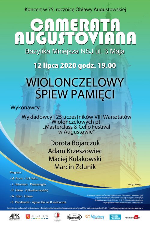 Augustowskie Placówki Kultury zapraszają na pierwsze tego lata wydarzenie z cyklu Camerata Augustoviana. 12 lipca 2020 roku w Bazylice Mniejszej p.w. Najświętszego Serca Jezusowego o godz. 19:00 rozpocznie się koncert „Wiolonczelowy śpiew pamięci”, poświęcony tragicznym wydarzeniom lipca 1945 roku.
