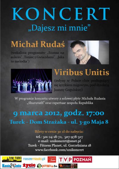Zapraszamy na koncert z okazji Dnia Kobiet pt. "Dajesz mi mnie", w którym wystąpi Michał Rudaś (wokalista programów "Taniec z Gwiazdami", "Jaka to melodia", "Szansa na sukces") oraz chór Viribus Unitis (jedyny chór w Polsce docierający ze swym przekazem do osób niesłyszących).