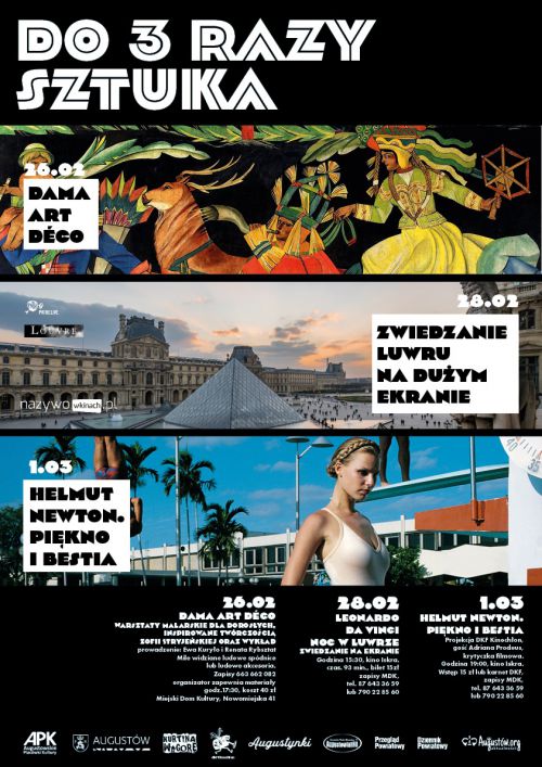 Artystyczna propozycja Kinochłona na wydarzenie pod nazwą „Do 3 razy sztuka” to film „Helmut Newton. Piękno i bestia”, czyli dokumentalna opowieść o autorze kultowych, przesiąkniętych erotyzmem kobiecych aktów. Sposób, w jaki Helmut Newton portretował kobiety, nadal prowokuje do pytania: czy były one podmiotami, czy przedmiotami? Zaskakujący obraz artysty ujawniają fotografowane przez niego top modelki, gwiazdy i aktorki. Catherine Deneuve, Grace Jones, Charlotte Rampling, Isabella Rossellini, Claudia Schiffer – portretowane portretują i odkrywają przed nami prawdę.