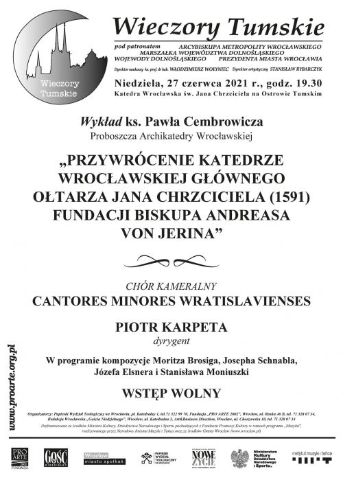 Czerwcowy Wieczór Tumski będzie poświęcony srebrnemu ołtarzowi biskupa Andreasa Jerina, który powrócił do wrocławskiej katery po 75 latach nieobecności. Zapraszamy serdecznie 27 czerwca br. do Katedry Wrocławskiej św. Jana Chrzciciela na Ostrowie Tumskim o godz. 19.30.