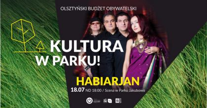 MOK Olsztyn zaprasza na bezpłatny, folkowo-orientalny koncert zespołu HabiArJan! Wydarzenie odbędzie się w niedzielę 18 lipca o godz. 18:00 na scenie w Parku Jakubowo, w ramach projektu "Kultura w Parku!", finansowanego z Olsztyńskiego Budżetu Obywatelskiego.