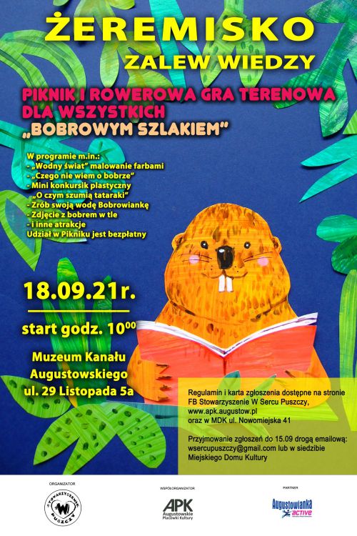 Stowarzyszenie W Sercu Puszczy we współpracy z Augustowskimi Placówkami Kultury serdecznie zapraszają drużyny rodzinne (i nie tylko) do udziału w rowerowej grze terenowej Bobrowym Szlakiem połączonej z piknikiem pod wspólnym hasłem: Żeremisko - zalew wiedzy.