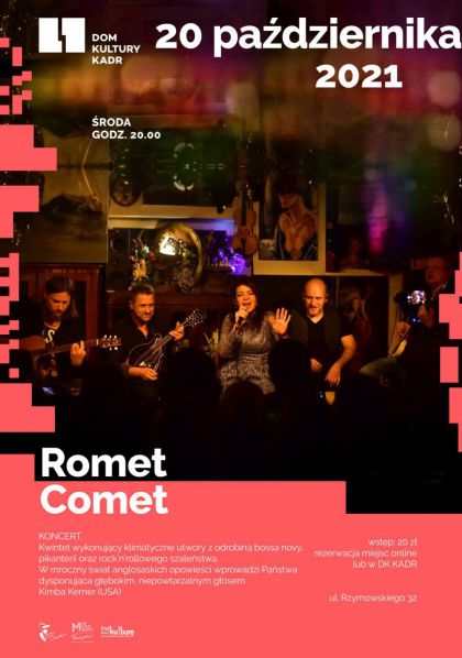 Romet Comet to kwintet wykonujący klimatyczne utwory z odrobiną bossa novy, pikanterii oraz rock’n’rollowego szaleństwa. W mroczny świat anglosaskich opowieści wprowadzi Państwa dysponująca głębokim, niepowtarzalnym głosem i prawdziwym amerykańskim akcentem Kimba Kerner (USA).