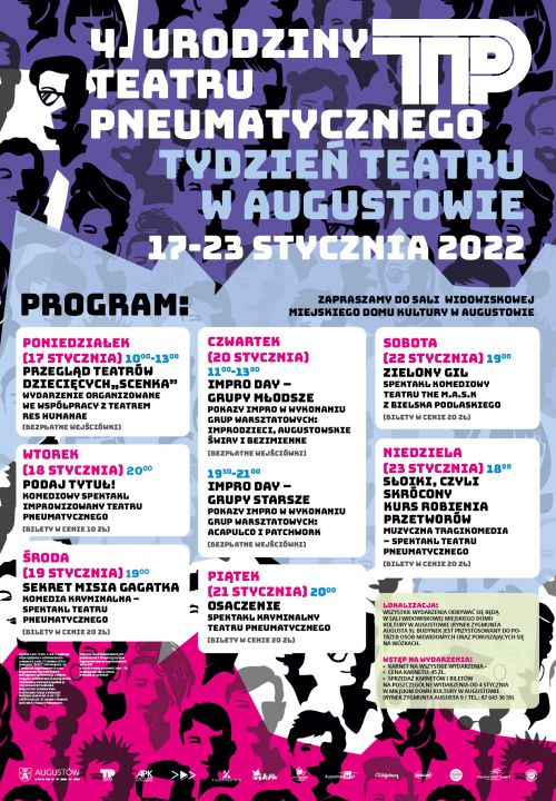 Działający przy Augustowskich Placówkach Kultury Teatr Pneumatyczny będzie obchodził w styczniu swoje czwarte urodziny. Aktorzy tworzący razem z Pawłem Leszkowiczem teatr amatorski zapraszają na Tydzień Teatru w Augustowie. W tym roku maraton teatralnych wydarzeń potrwa od 17 do 23 stycznia.