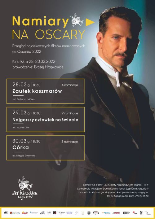 DKF KINOCHŁON zaprasza na ósmą edycję wydarzenia pod nazwą „Namiary na Oscary” – w ostatnich dniach marca pokażemy Państwu filmy, które ścigają się o statuetkę w najważniejszych kategoriach. To trzy dni z rewelacyjnym kinem, dobrym prowadzącym i fantastycznymi gośćmi. Mamy nadzieję, że wieczory od 28. do 30. marca spędzimy wspólnie w augustowskim kinie Iskra (ul. 3 Maja 38). Oto, co dla Państwa przygotowaliśmy:
