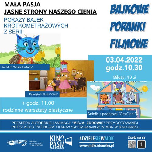 Projekcja bajek krótkometrażowych „Nasze kształty” z serii Kot Miro, „Cień” z serii Pamiętnik Florki, „Gra cieni ” z serii Aniołki z poddasza oraz premiera autorskiej animacji „Misja: Zdrowie” przygotowanej przez Koło Twórców Filmowych działające w Miejskim Domu Kultury w Radomsku.
