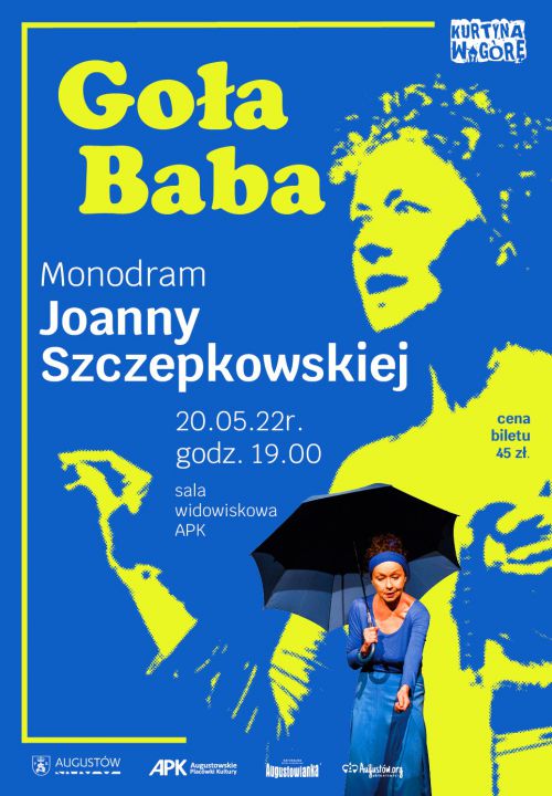 Augustowskie Placówki Kultury zapraszają na teatralne spotkanie z aktorką Joanną Szczepkowską. 20 maja 2022 roku o godz. 19:00 na scenie Miejskiego Domu Kultury w Augustowie będzie można zobaczyć spektakl pt. „Goła baba”.