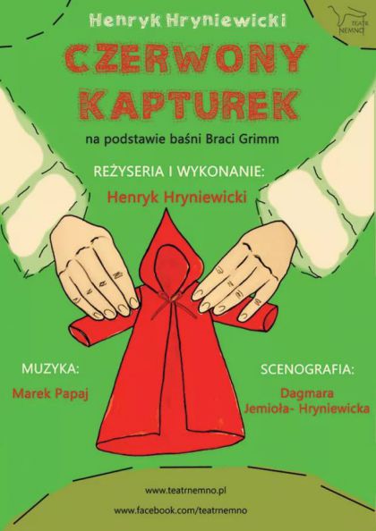Spektakl Czerwony kapturek w wykonaniu teatru NEMNO. Pewien krawiec chciał uszyć nowe ubrania dla dzieci, niestety zabrakło mu materiału. Został tylko czerwony aksamit. Ten niezwykły materiał przywołuje mu wspomnienie o pewnej Babci, która bardzo kochała swoją wnuczkę. Krawiec postanawia opowiedzieć ich historię i na oczach widzów kreuje świat baśni.