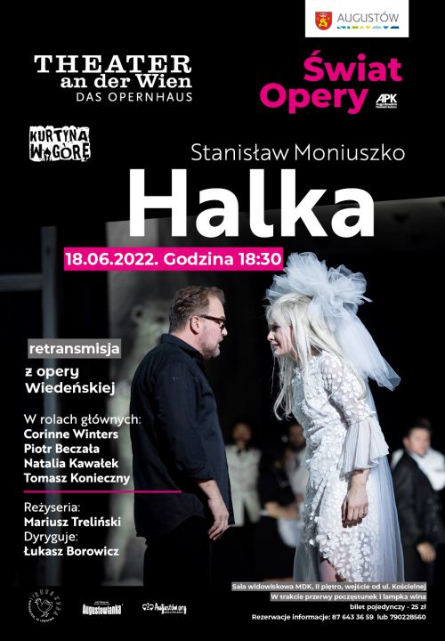 Augustowskie Placówki Kultury zapraszają na kolejne wydarzenie w ramach cyklu retransmisji wielkich sztuk operowych. W sobotę 18 czerwca 2022 w sali widowiskowej Miejskiego Domu Kultury w Augustowie (Rynek Zygmunta Augusta 9, wejście od ul. Kościelnej, II piętro) o godz. 18:30 wyświetlimy „Halkę” Stanisława Moniuszki, zarejestrowaną w Theater an der Wien.