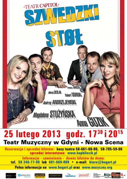 Zawodowcy zajmujący się rozrywką estradową i sceniczną. Anna Guzik - wyraźna komediowa osobowość sceniczna i telewizyjna, Robert Górski i Mikołaj Cieślak z Kabaretu Moralnego Niepokoju, znani choćby z kultowych już "drzwi" czy "posiedzenia rządu", a ponadto Andrzej Andrzejewski, Arkadiusz Janiczek i Tomek Bednarek jako, jak się okaże - kluczowe postaci całej intrygi. I to wszystko na jednej kipiącej vis comica scenie. Tego jeszcze nie było! Kumple z podstawówki. Łączy ich wiele - dzieli wszystko. Spotykają się po latach. I nagle, w trakcie spokojnej rozmowy, akcja gwałtownie przyśpiesza i wszystko zmienia się w zaskakujący, przezabawny kalejdoskop sytuacji, zdarzeń, w którym stara znajomość zostaje wystawiona na ciężką próbę. Kumple, żona, przyjaciółka, szef wszystkich szefów - na "Szwedzkim stole" nagle kłębi się miłość, przyjaźń, czasem show, czasem biznes, zdrada, pieniądze, perwersja. Jest śmiesznie, jest gorąco, a czasem nawet hmmm? wzruszająco. Przekonaj się, jak wygląda najbardziej fachowa rozrywka sezonu!