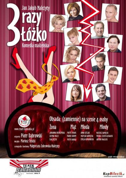 On i Ona, mąż i żona w sypialni. Trzy potyczki, trzy ważne rozmowy, trzy przełomowe momenty w życiu pewnej pary. A wszystko pod jedną kołdrą. Gdyby pokusić się o stworzenie rankingu mebli, które odgrywają najważniejszą rolę w życiu człowieka, bez wątpienia łóżko znalazłoby się w ścisłej czołówce. Nic dziwnego zatem, że i małżeństwo ze sztuki Jana Jakuba Należytego rozgrywa swoje namiętności, wątpliwości, ważne decyzje i słabości właśnie w pościelowych dekoracjach. Trzy odsłony, trzy noce, trzy momenty z ich życia, trzy punkty zwrotne - okazuje się, że tyle wystarczy, by opowiedzieć zabawną historię o pewnej parze aktorów. W łóżku On i Ona gubią się i odnajdują do siebie drogę, rozgrywają namiętny dramat i codzienność. Komedia Jana Jakuba Należytego "Trzy razy łóżko" grana jest od lat w trzech repertuarowych teatrach w Polsce: Teatr Dramatyczny im. Węgierki w Białymstoku - ponad 150 przedstawień, Teatr Mały w Manufakturze w Łodzi - ponad 80 przedstawień oraz Teatr Komedia we Wrocławiu od maja tego roku. W tym teatrze sztuka grana jest również w wersji niemieckojęzycznej. Jan Jakub Należyty - autor takich przebojów scenicznych jak "Andropauza męska rzecz! Zdecydowana odpowiedź na Klimakterium" oraz "Diety cud" i "Andropauzy 2" oraz doborowa obsada aktorska gwarantują półtorej godziny mądrego, życiowego śmiechu. Małżeństwa odnajdą siebie: swoje sprzeczki i momenty czułych pogodzeń. Swoje troski o dorastające dzieci. Wady i słabości partnerów i prawdziwą miłość. Ci, którzy zamierzają wstąpić w związek małżeński zobaczą siebie za kilka lat!