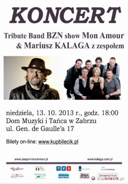 Holenderski zespół Mon Amour - Tribute Band BZN to niepowtarzalny, wspaniały, hipnotyzujący swoją muzyką zespół, zabierze nas w muzyczną podróż w czasie. Przypomni i zaśpiewa legendarne, piękne utwory bardzo popularnej w latach 80. i 90. grupy BZN (Sevilla, Mon Amour, Troubadour, Nathalie, Goodbye, Love's Like a River). Połączenie tamtych przebojów z kompozycjami własnymi Mon Amour (Sicilian Nights, Come sing and dance, Madelon, Once in a lifetime) ozdobione charakterystycznymi głosami wokalistów Petera de Haana i Lindy to fantastyczna muzyczna uczta dla uszu i oczu. Podczas koncertu usłyszymy również najnowsze kompozycje Mon Amour z albumu "Sing me a song" (zaśpiewaj mi piosenkę), albumu, który powstał właśnie z miłości do muzyki. Z kolei w drugiej części koncertu wystąpi Mariusz Kalaga z zespołem. Ten doskonale znany nie tylko na Śląsku piosenkarz i wykonawca estradowy, śpiewający głosem o dużej skali i charakterystycznej, ciepłej barwie, w swoim repertuarze ma wiele znanych przebojów, m.in.: "Jedna z gwiazd", "Nie zapomnę tamtej nocy", "Co tu jest grane?", "Sen o Dalmacji", "Gdy się napełni szkło", "Teraz jesteś tylko moja", "Nie więdnij mój kwiatku", a także przeboje Roya Orbisona - "California Blue" czy Elvisa Presleya - "It's now or neper". Mariusz Kalaga łatwo i szybko nawiązuje kontakt z publicznością, a jego ciekawe i wesołe komentarze oraz interpretacje wykonywanych utworów są atrakcją każdego koncertu. Zapowiada, że w tym koncercie zgromadzona publiczność w Domu Muzyki i Tańca usłyszy kilka muzycznych niespodzianek. Podczas koncertu zespół Mon Amour i Mariusz Kalaga wspólnie zaśpiewają kilka hitów z repertuaru holenderskich muzyków, m.in.: "Życie, czy kariera" - tyt. org. "La Gomera", "Spoglądam w twoje okno" - tyt. org. "El amor de mi vida", czy "Świata lepiej nie naprawiaj" - tyt. org. "Once in a lifetime".