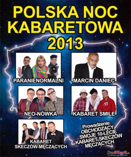 Są naszą tradycją i narodowym sportem, w którym zawsze wygrywamy. Polskie Noce Kabaretowe to wieloletnia historia, która nie ma swojego odpowiednika nigdzie indziej na świecie. To także wspólny projekt grupy kabaretowych przyjaciół, którzy z szacunku do polskiej tradycji chcą ją kontynuować i ubarwiać nutką nowoczesności. Podczas Nocy Kabaretowych widzowie zasmakują różnorodności rodzimego kabaretu i odkryją wszystkie jego oblicza. Naszą kabaretową drużynę narodową tworzą przedstawiciele dojrzałej ligi, którym sekundują młodzi, ale już utytułowani zawodnicy. Wspólnie grają do jednej bramki, a ich celem jest dostarczenie publiczności wspaniałej zabawy, której jakość godna jest miana Polskich Nocy Kabaretowych. Prowadzenie Polskiej Nocy Kabaretowej to nie lada wyzwanie, którego podjęli się doświadczeni i lubiani przez publiczność artyści. Tegoroczną edycję Polskich Nocy Kabaretowych poprowadzi Kabaret Skeczów Męczących obchodzący w tym roku swoje dziesięciolecie. W Opolu wystąpią między innymi: Marcin Daniec, Kabaret Paranienormalni, Kabaret Skeczów Męczących, Kabaret Nowaki. Zapraszamy poniżej do rezerwacji biletów...