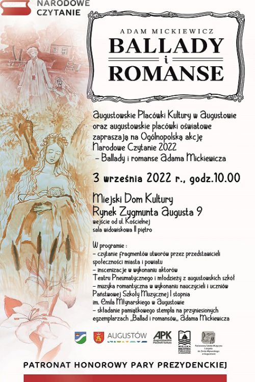Spotkajmy się 3 września 2022 (sobota) o godz. 10:00 w sali widowiskowej Miejskiego Domu Kultury (Rynek Zygmunta Augusta 9, wejście od ul. Kościelnej, II piętro), by wspólnie przeczytać „Ballady i romanse” Adama Mickiewicza.