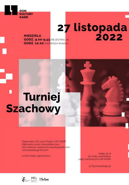 wstęp: 40 zł (20 zł dla uczestników zajęć szachowych w DK Kadr)