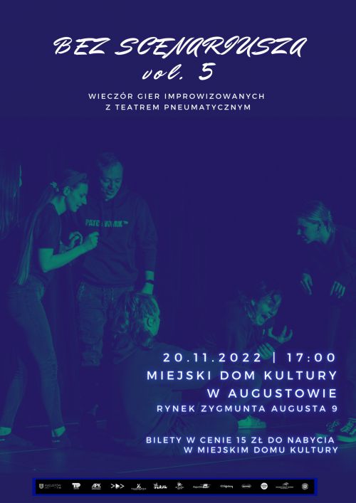 Augustowskie Placówki Kultury i Teatr Pneumatyczny serdecznie zapraszają we niedzielę 20 listopada o godz. 17:00 do Sali widowiskowej Miejskiego Domu Kultury (Rynek Zygmunta Augusta 9, wejście od ul. Kościelnej, II piętro) na piątą już edycję „BEZ SCENARIUSZA”, czyli Wieczoru gier improwizowanych z Teatrem Pneumatycznym.