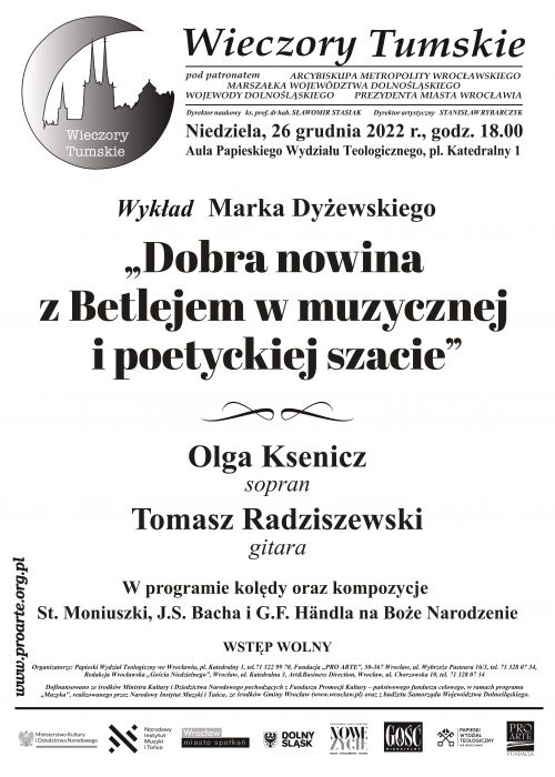 Zapraszamy serdecznie na grudniowy Wieczór Tumski zorganizowany z okazji Bożego Narodzenia. W poniedziałek 26.12 br., w drugi dzień świąt, o godzinie 18:00 w Auli Papieskiego Wydziału Teologicznego usłyszymy wykład Marka Dyżewskiego pt.: „Dobra nowina z Betlejem w muzycznej i poetyckiej szacie”.