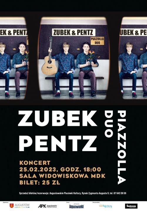Augustowskie Placówki Kultury zapraszają w sobotę 25 lutego 2023r. o godz. 18:00 do sali widowiskowej miejskiego Domu Kultury (Rynek Zygmunta Augusta 9, wejście od ul. Kościelnej) na koncert projektu Zubek & Pentz Piazzolla Duo.