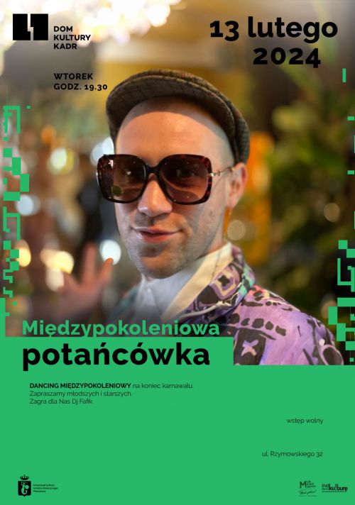 DANCING MIĘDZYPOKOLENIOWY na koniec karnawału w kadrowym holu. Zapraszamy młodszych i starszych! W muzyczną podróż od lat 60 aż po czasy współczesne, po kilku kontynentach i kilkunastu muzycznych gatunkach, zabierze Was Fafik – warszawski DJ, znany z zamiłowania do zabawy stylami.