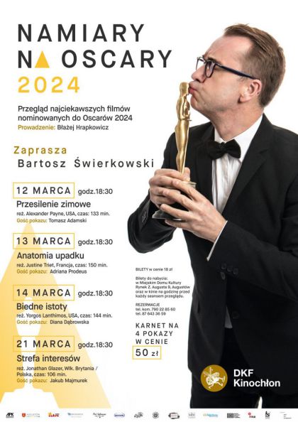 DKF KINOCHŁON zaprasza na dziesiątą już (!) edycję wydarzenia „Namiary na Oscary” – w połowie marca, kolejny raz, spotkamy się w augustowskim kinie Iskra (ul. 3 Maja 38), by obejrzeć i przedyskutować filmy, które ścigają się o statuetkę Oscara w najważniejszych kategoriach. W tym roku to aż 4 dni z rewelacyjnym kinem, dobrym prowadzącym i fantastycznymi gośćmi. Mamy nadzieję, że cztery marcowe wieczory spędzimy wspólnie. Oto, co dla Państwa przygotowaliśmy: