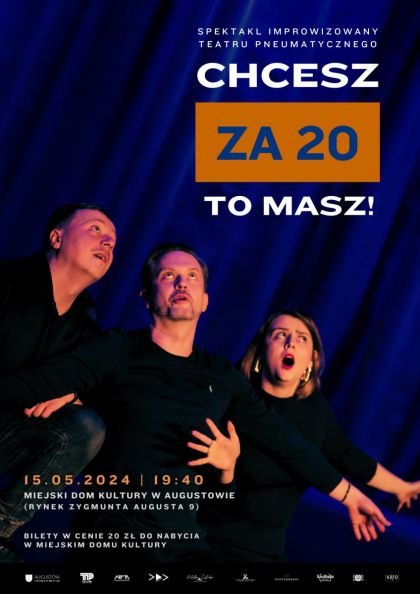 Augustowskie Placówki Kultury i Teatr Pneumatyczny serdecznie zapraszają w środę 15 maja o godz. 19:40 (chcesz za 20, to masz!) do sali widowiskowej Miejskiego Domu Kultury (Rynek Zygmunta Augusta 9, wejście od ul. Kościelnej, II piętro) na kolejną odsłonę spektaklu improwizowanego Teatru Pneumatycznego.