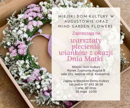 Miejski Dom Kultury w Augustowie oraz Mind Garden Flowers zapraszają na warsztaty plecenia wianków z okazji Dnia Matki.