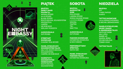 Night Embassy Warsaw to niekończąca się lista atrakcji: inspirujące warsztaty, prowokujące panele dyskusyjne, niepowtarzalne występy na żywo, sety DJ-skie, performansy, wystawy i wiele więcej. To trzy dni, podczas których sztuka, muzyka, moda i tatuaż łączą się w niezapomniane przeżycie.