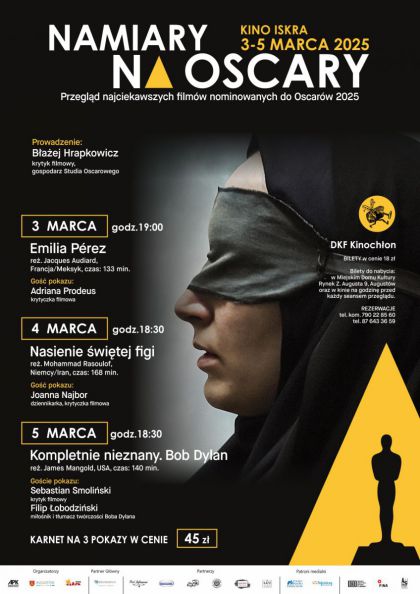 DKF KINOCHŁON zaprasza na kolejną edycję wydarzenia pod nazwą „Namiary na Oscary” – na początku marca pokażemy Państwu filmy, które ścigają się o statuetkę w najważniejszych kategoriach. To trzy dni ze świetnym kinem, doświadczonym prowadzącym i fantastycznymi gośćmi! Mamy nadzieję, że wieczory od 3. do 5. Marca 2025 spędzicie Państwo z nami w augustowskim kinie Iskra (ul. 3 Maja 38). Spójrzcie tylko, co nas czeka: