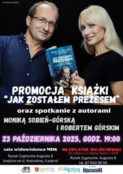Poznaj kulisy popularnego serialu „Ucho Prezesa”, stworzonego przez satyryka Roberta Górskiego (Kabaret Moralnego Niepokoju) – przyjdź na spotkanie z autorami książki „Jak zostałem Prezesem”, na które zapraszają Augustowskie Placówki Kultury w środę 23 października 2025 o godz. 19:00 do sali widowiskowej MDK (Rynek Zygmunta Augusta 9, wejście od ul. Kościelnej, II piętro).