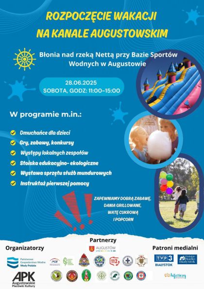 Państwowe Gospodarstwo Wodne Wody Polskie - Regionalny Zarząd Gospodarki Wodnej w Białymstoku oraz Augustowskie Placówki Kultury serdecznie zapraszają do Augustowa na rozpoczęcie wakacji na Kanałem Augustowskim zaplanowane na sobotę 28 czerwca 2025r.
