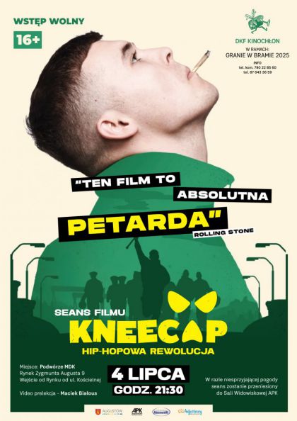 Augustowskie Placówki Kultury i DKF KINOCHŁON zapraszają w piątek 4 lipca 2025 r. na podwórze Miejskiego Domu Kultury (Rynek Zygmunta Augusta 9), gdzie o godz. 21:30 obejrzymy szaloną muzyczną komedię – irlandzkiego kandydata do Oscara i zdobywcę Nagrody Publiczności na Sundance – film pt. „Kneecap. Hip-hopowa rewolucja” w reżyserii Richa Peppiatta.