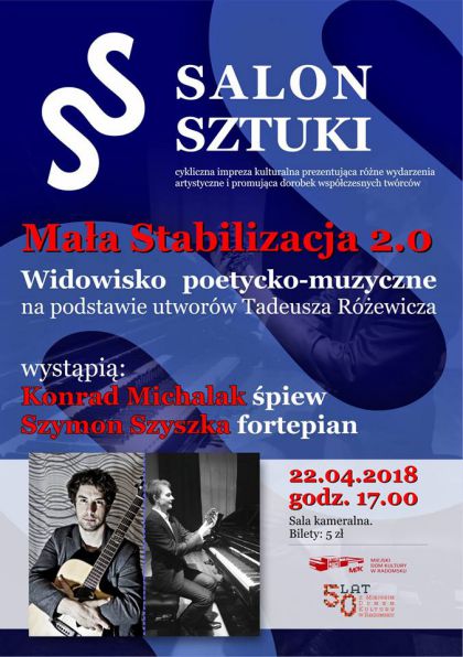 22 kwietnia 2018 o godz. 17.00 w Salonie Sztuki zapraszamy na widowisko poetycko muzyczne "Mała Stabilizacja 2.0". Program łączy utwory Tadeusza Różewicza (śpiew - Konrad Michalak) z muzyką współczesną (fortepian - Szymon Szyszka). Spektakl prezentuje kondycje człowieka na tle przemian społeczno-politycznych, dotyka fundamentalnych kwestii związanych z ludzką egzystencją, odwołując się jednocześnie do literackiej filozofii Tadeusza Różewicza.